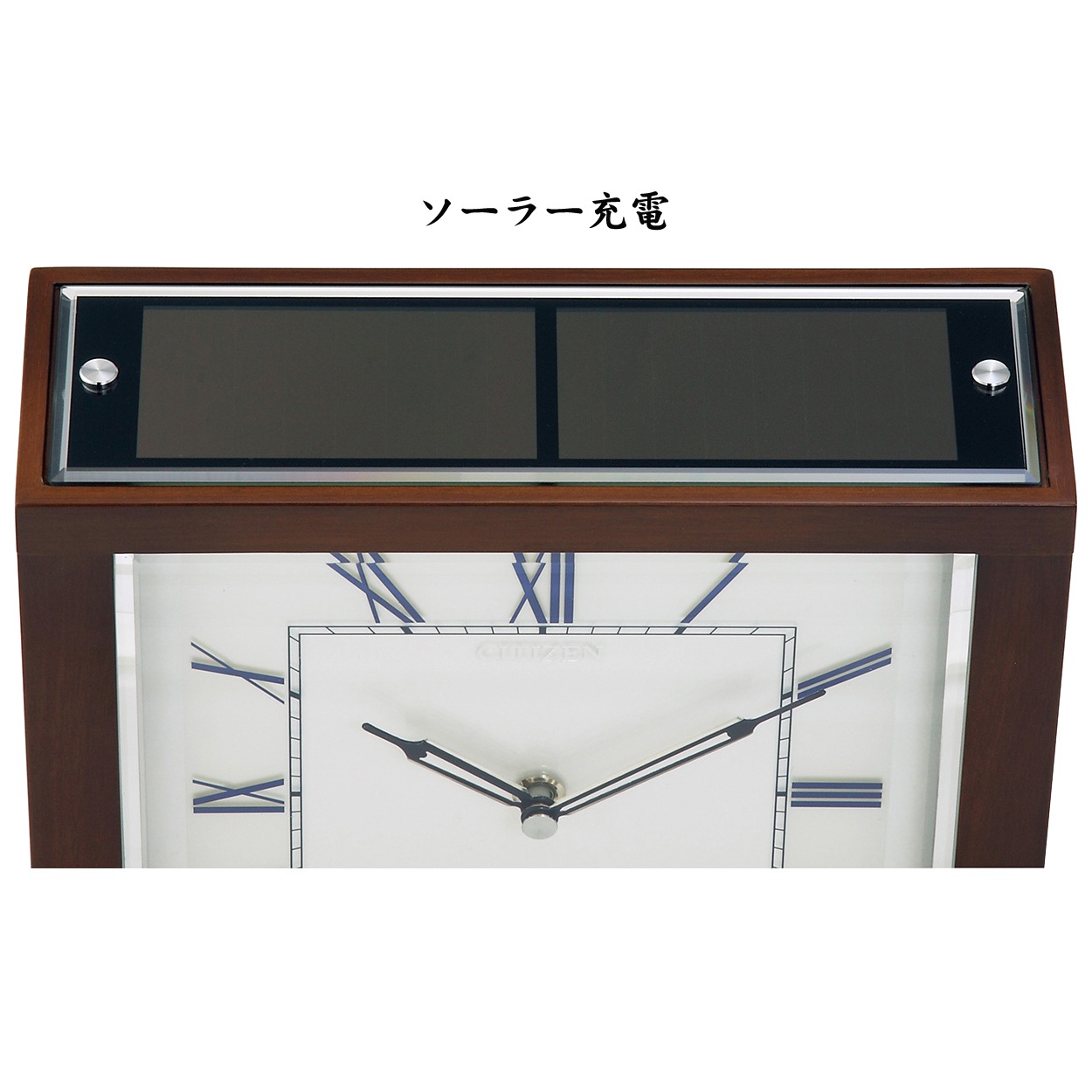 時計本体の上部にはソーラー電源を設け明るい場所では光によって駆動、余った電力は蓄電池に充電して動電力する環境にやさしい電波置き時計です。